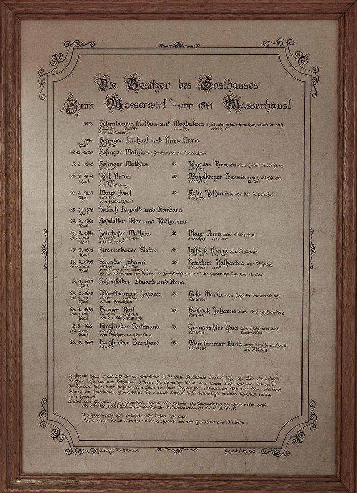 Das Haus des Wasserwirten hat eine lange Geschichte. Es wird 1750 errichtet und nennt sich anfangs „Wasserhäusel“. 1841 wird es dann zu „Gasthaus zum Wasserwirten“ umbenannt . Den Namen hat das Haus der Nähe zum Fluss Rodl zu verdanken.